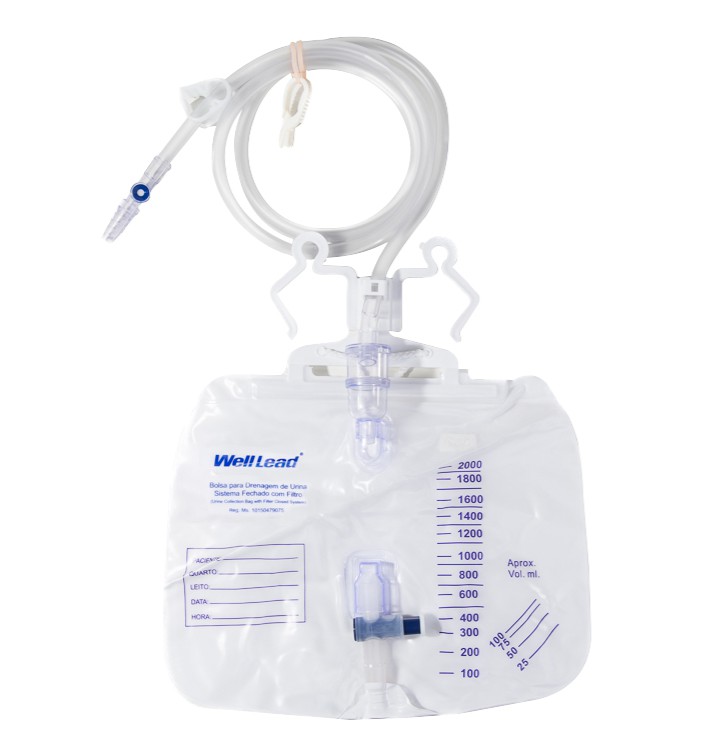 O coletor de urina de sistema fechado modelo quadrado Well Lead tem capacidade de 2000ml, face anterior transparente, medida de pequenos volumes a partir de 25ml, graduado de 100 em 100ml nos volumes maiores. Conta com câmara de Pasteur, válvula antirefluxo, alça dupla de fixação beira leito e cordão para transporte. Coldre central rígido para acomodar a válvula de drenagem evitando risco de contaminação. Ponto de coleta de urina sem agulha needle less.