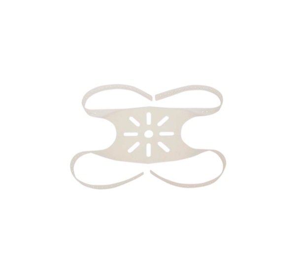 Fixador cefálico confeccionado em silicone flexível. Possui ajuste com perfurações nas extremidades regulagem do fixador junto à cabeça e a máscara.